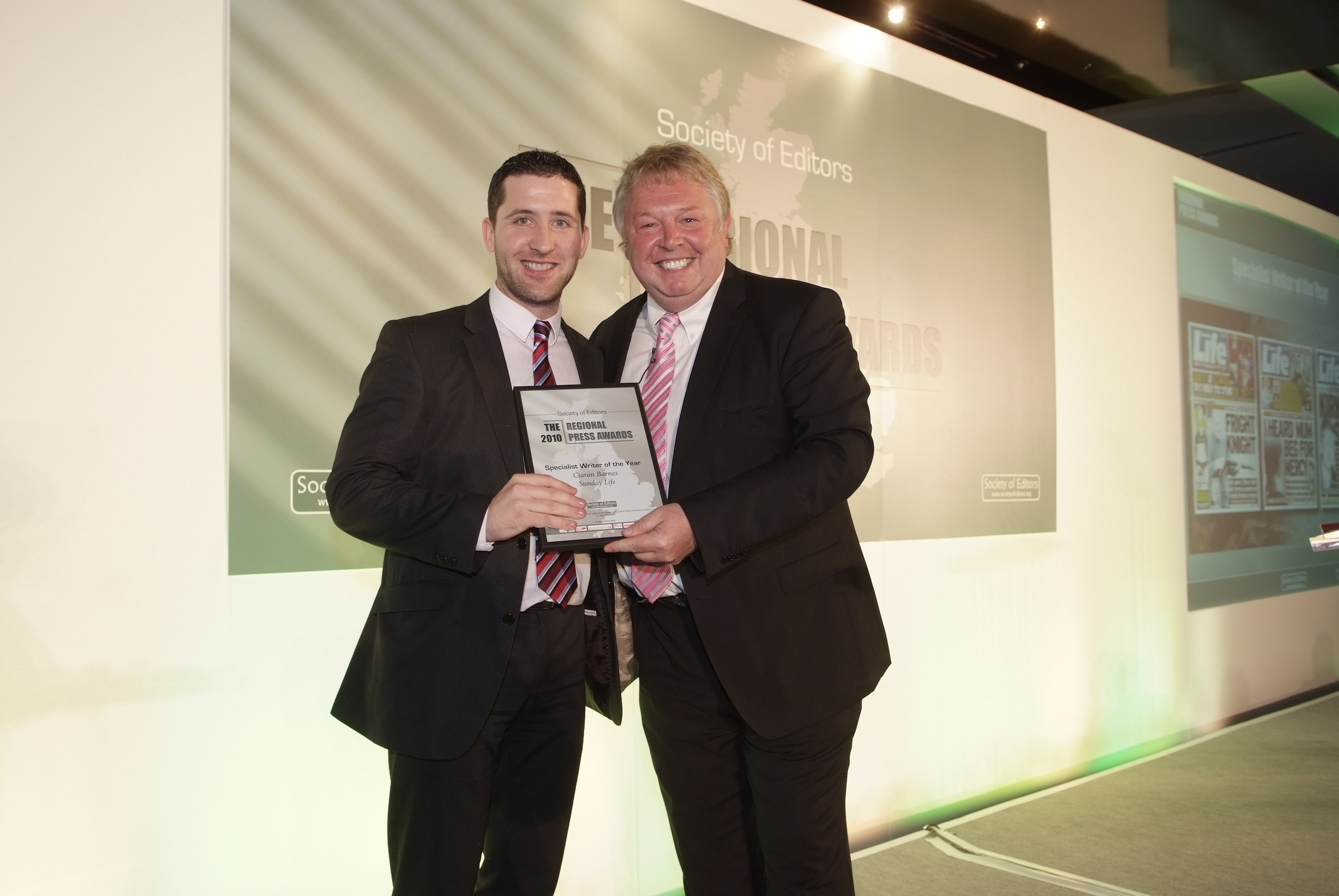 In May 2011, a few days after the US Department of Justice served subpoenas on Boston College, the Regional Press (i.e. provincial newspapers) awards ceremony was held in London. Hosted by the Society of Editors, the three NI-based players in the Boston College drama, Irish News editor Noel Doran, Irish News reporter Allison Morris and Sunday Life reporter Ciaran Barnes all won prizes. Here Barnes accepts the Specialist Writer of the Year award.