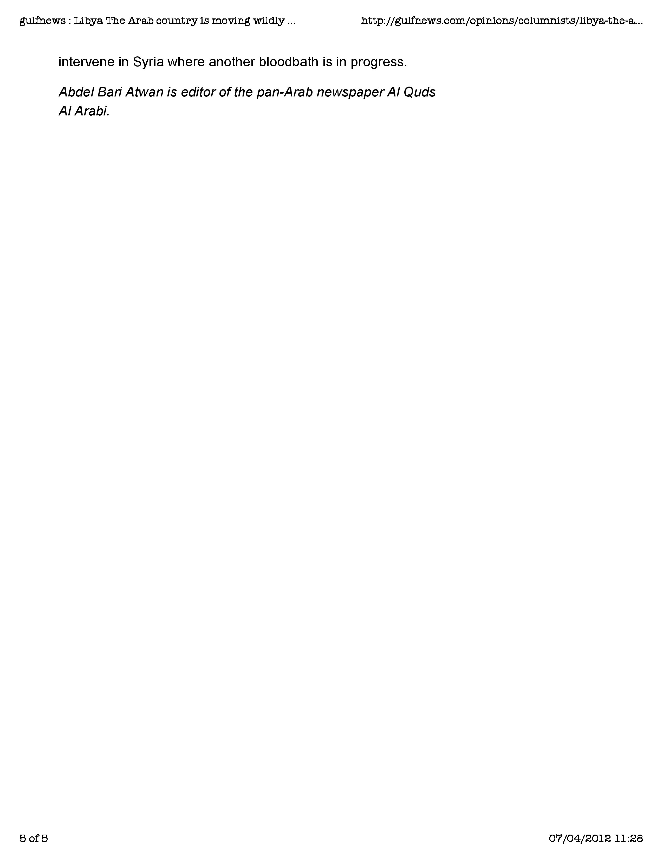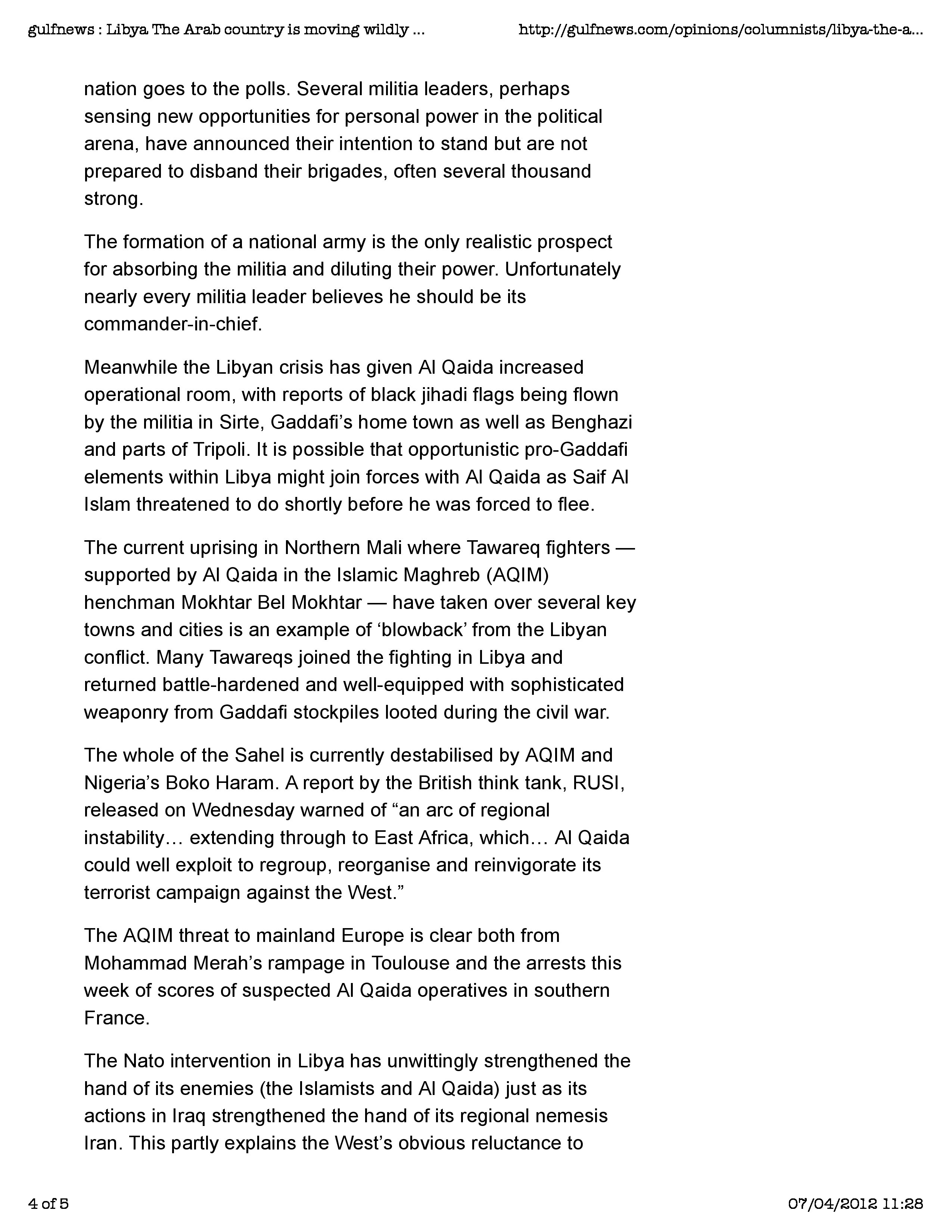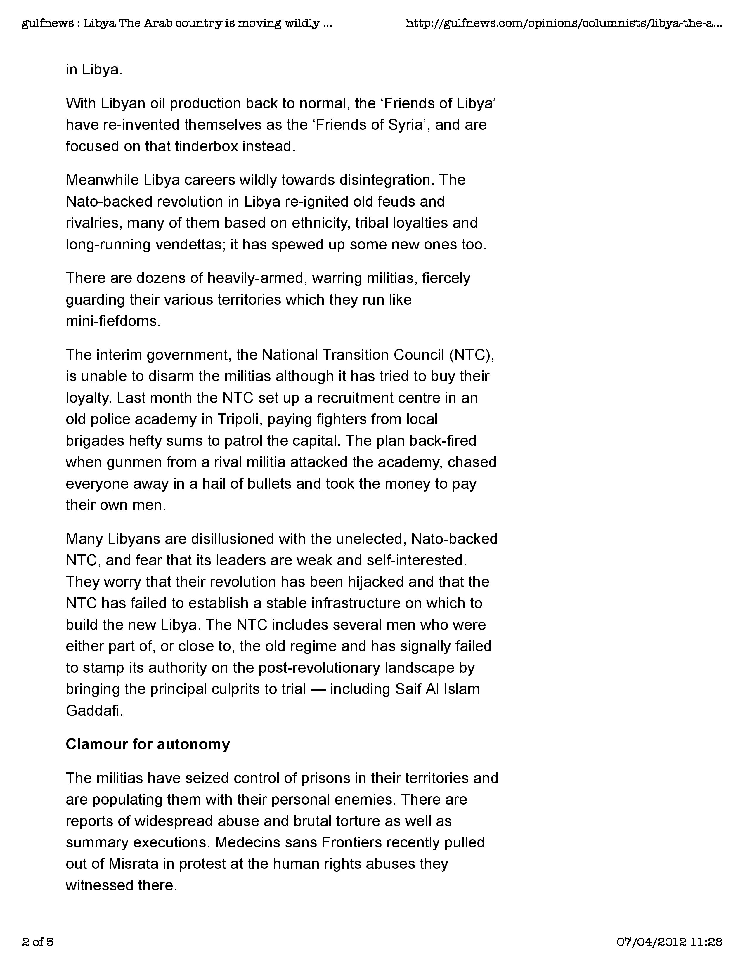An interesting piece from gulfnews.com about Libya six months after the rebellion which ousted Col. Muammar Gaddafi from power and led to his death. Libya has more or less dropped out of the news and the focus of Western media attention has shifted to Syria. From this account it seems that the West, having accomplished the downfall of Gaddafi and secured control of the country’s oil supplies, has decided to leave Libya to its fate, allowing the country to disintegrate into tribal and regional conflict. Wasn’t this all supposed to have been about restoring democracy and the rule of law to Libya, returning dignity and prosperity to its people? The fragmenting of Libya, its removal as an obstacle to Western ambitions in that part of the Middle East carries a message the people of Syria may want to heed.
