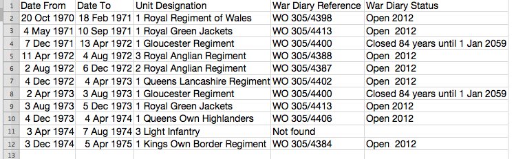 List of regiments that served in Divis in early 1970’s. The First Goucesters are the only unit whose war diaries have been embargoed until 2059. All the others are available for public inspection.
