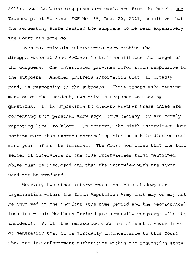 Here then is the relevant part of Judge Young’s judgement.  I reproduce it without comment. These interviews discussed by Young were sought by the PSNI under a second subpoena served two or more months after the first. The first subpoena dealt with Brendan Hughes’ and Dolours Price’s interviews with Anthony McIntyre. I wish to repeat again for the umpteenth time: in her interview with Anthony McIntyre for the Belfast Project she did not, repeat not, that is NOT, even mention Jean McConville’s name much less describe her death.