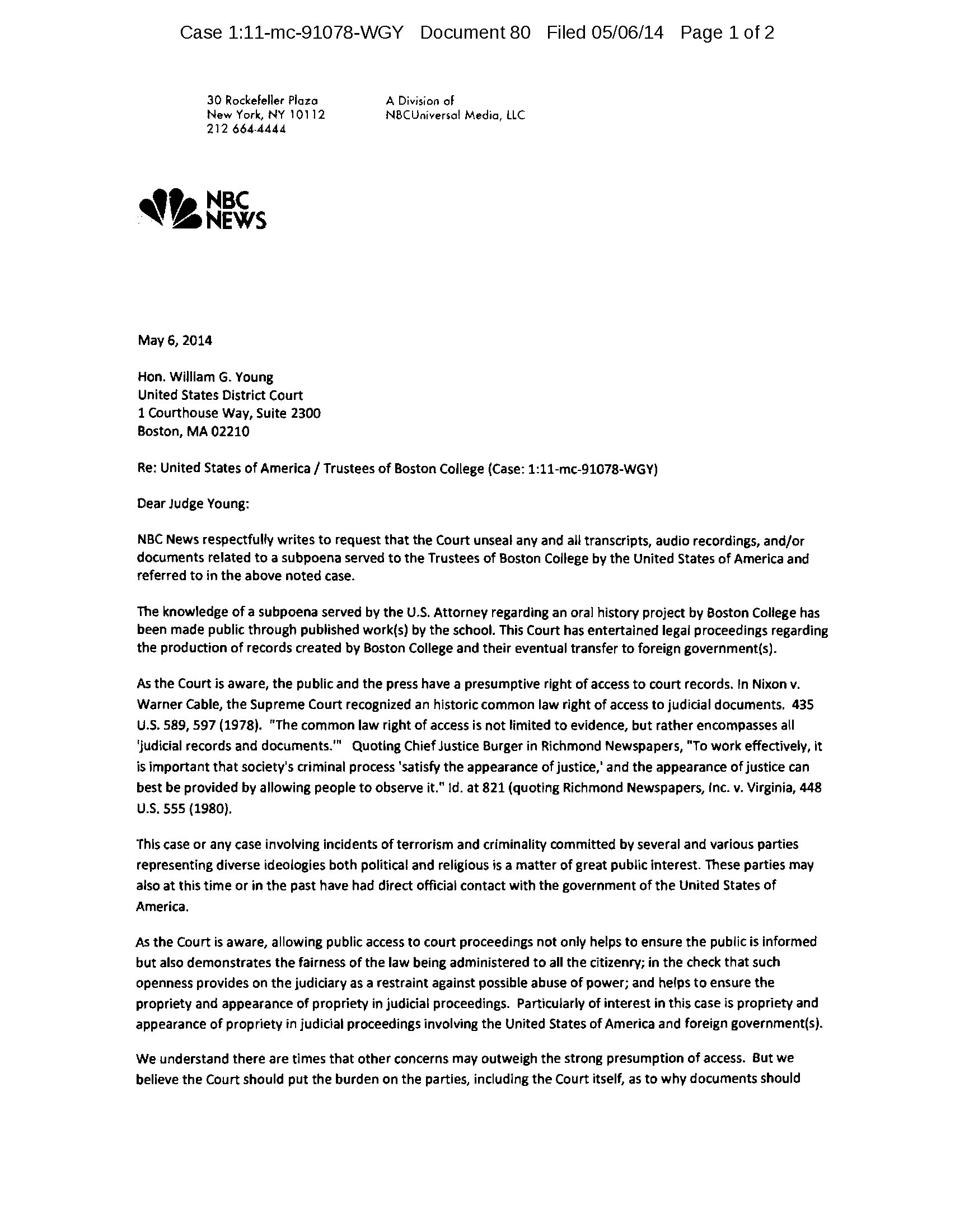 Thebrokenelbow.com has learned in the last few minutes that NBC News has written to Judge William Young of the Boston Federal District Court asking that the court unseal all transcripts, audio recordings and documents handed over to the PSNI on foot of the subpoenas served on Boston College.