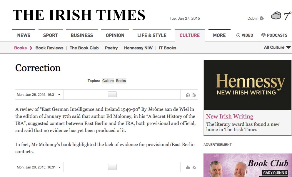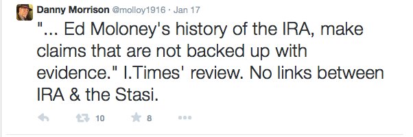The comment angered me, needless to say, but it was also puzzling. As the friend who alerted me to the Morrison comment pointed out I never made any connections at all between the IRA and the Stasi in ‘A Secret History of the IRA’ (not ‘a history of the IRA’ as Scally called it).