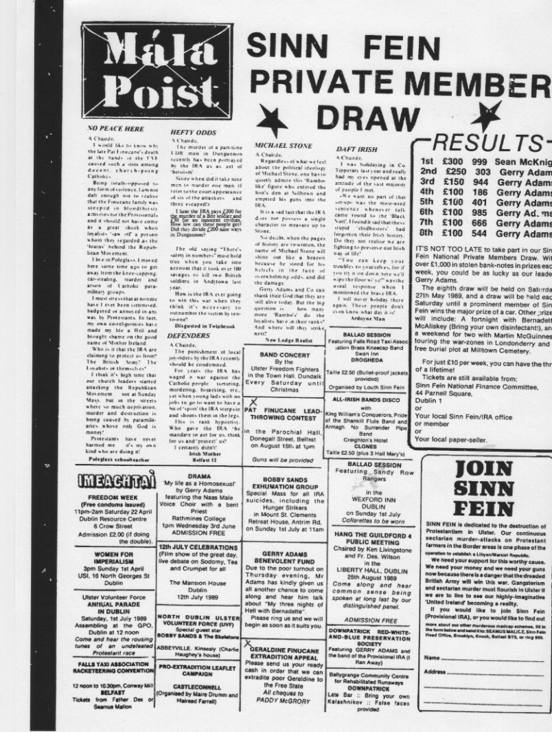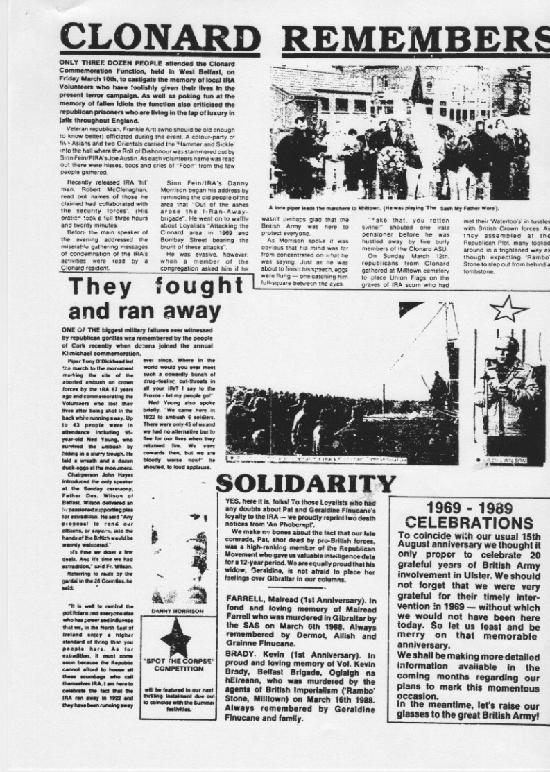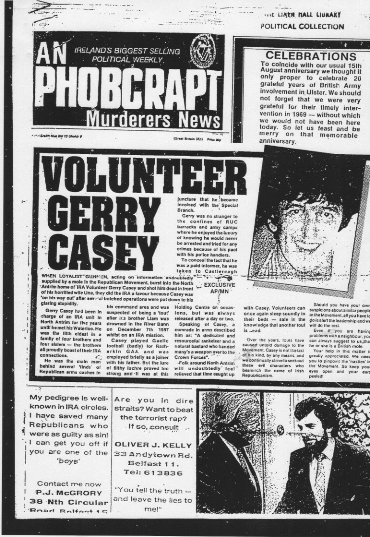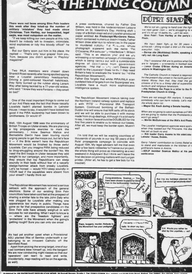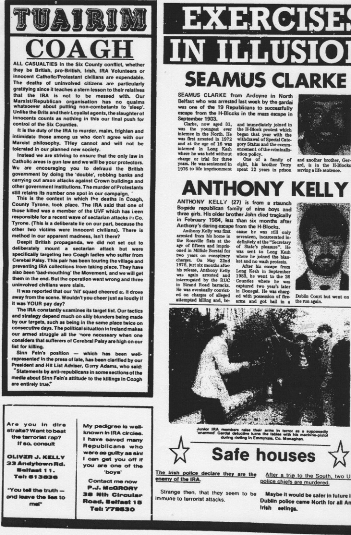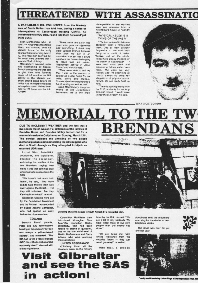 This was an eight-page take off of the weekly Sinn Fein-IRA paper, An Phoblacht-Republican News which the UDA dubbed ‘An Phobcrapt-Murderers News‘. It started to appear about Christmas time 1988 and was published on an erratic basis until after Pat Finucane’s assassination, i.e. for about a year or so.