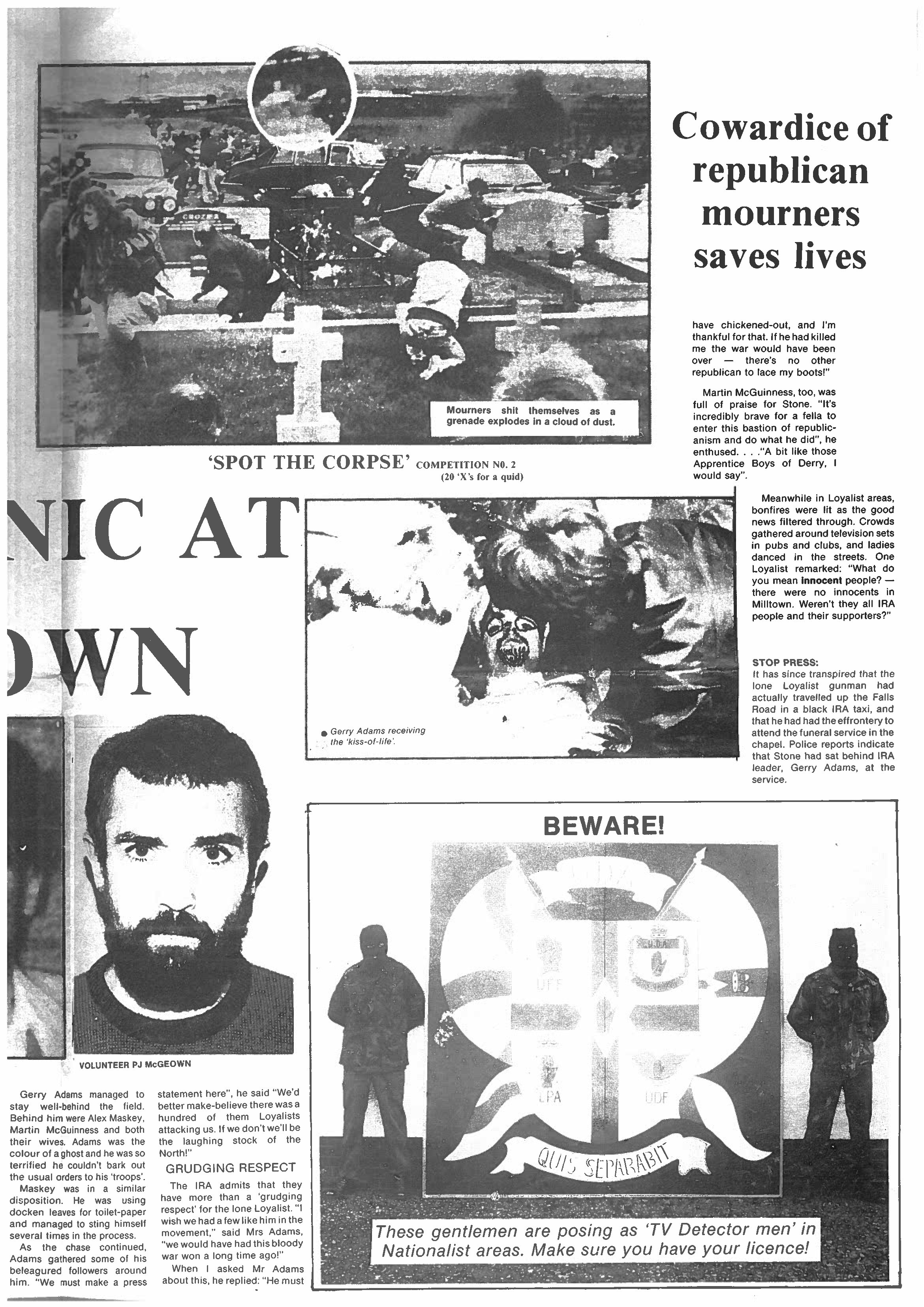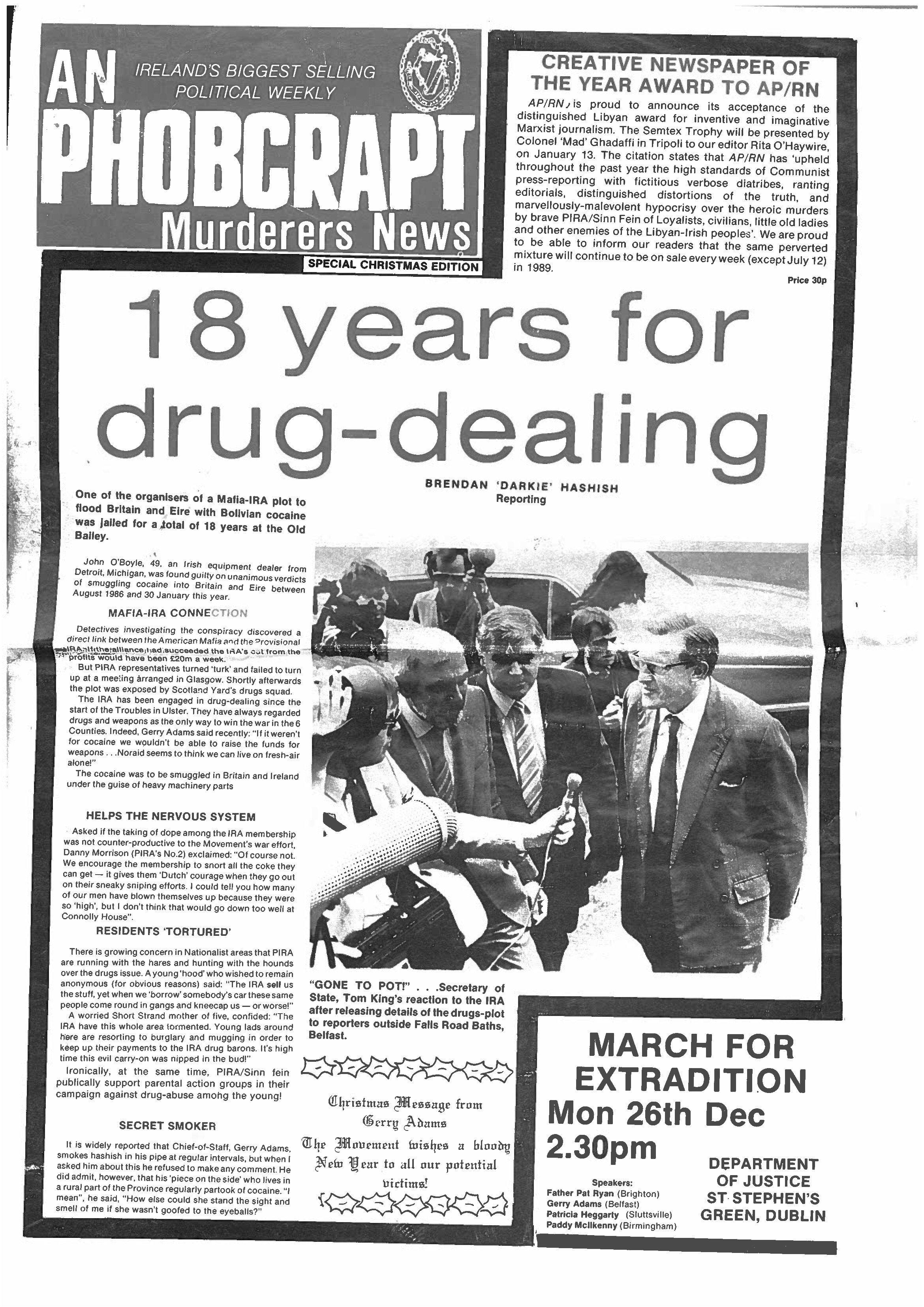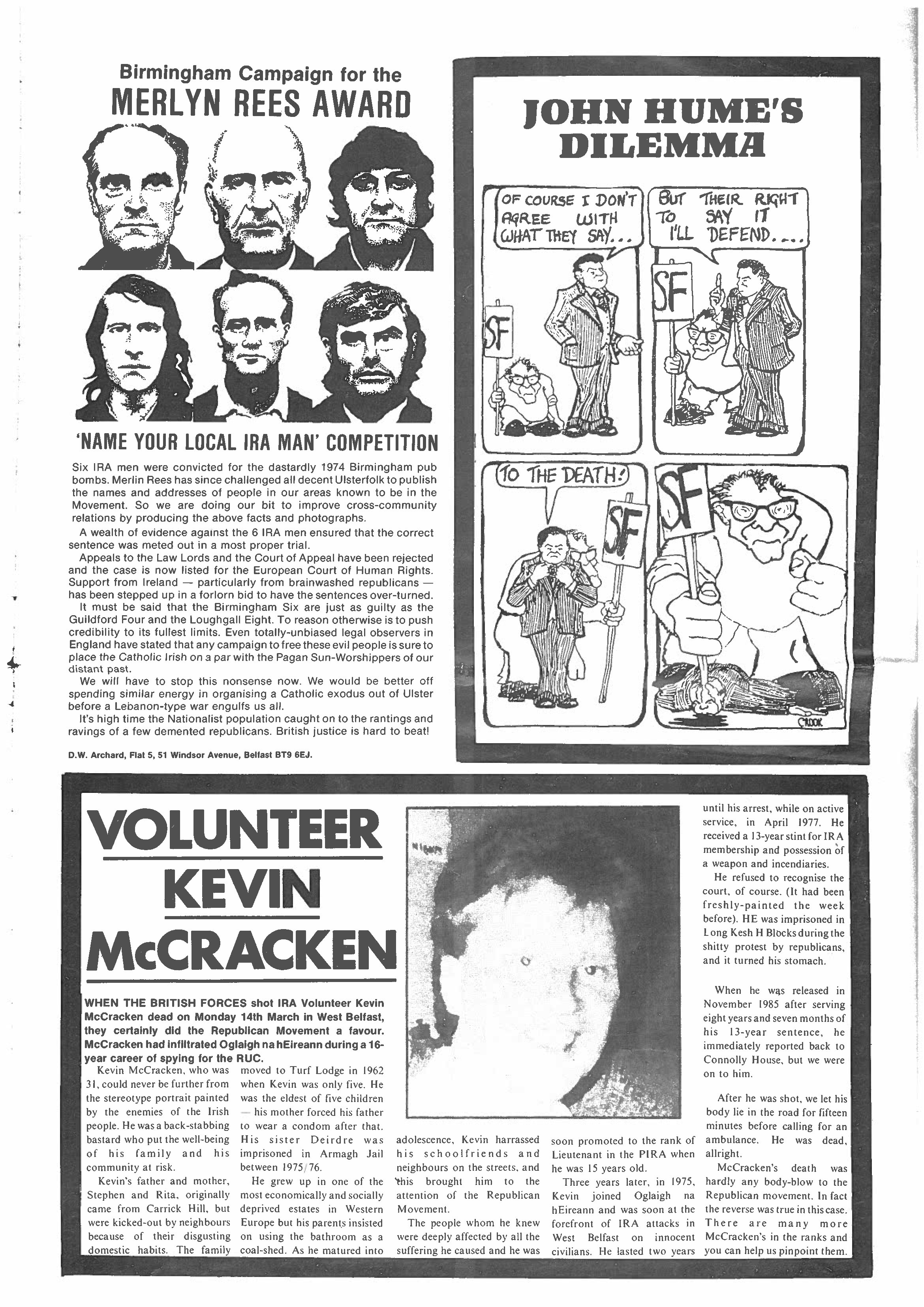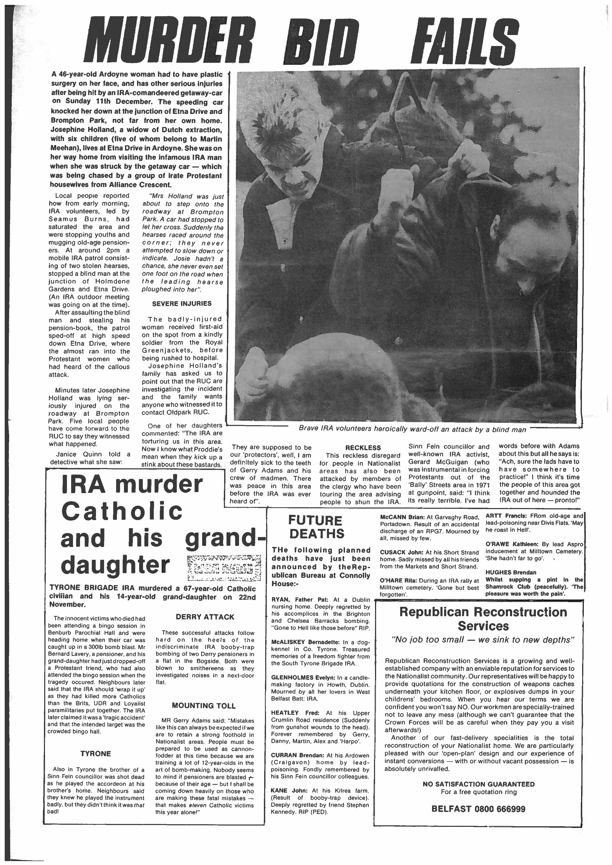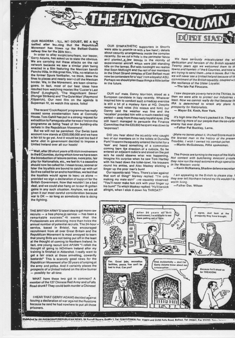 This was an eight-page take off of the weekly Sinn Fein-IRA paper, An Phoblacht-Republican News which the UDA dubbed ‘An Phobcrapt-Murderers News‘. It started to appear about Christmas time 1988 and was published on an erratic basis until after Pat Finucane’s assassination, i.e. for about a year or so.