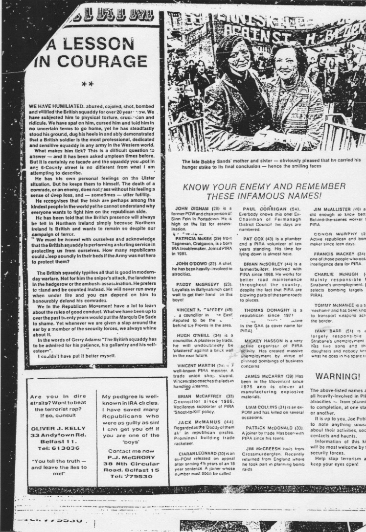 ….propaganda against specific PIRA figures was a tactic that could be used against individuals who were either assessed to be unrecruitable as agents or who had been approached and had refused to become agents.