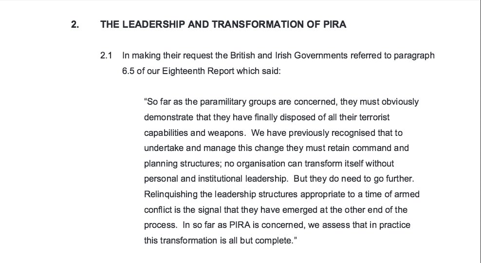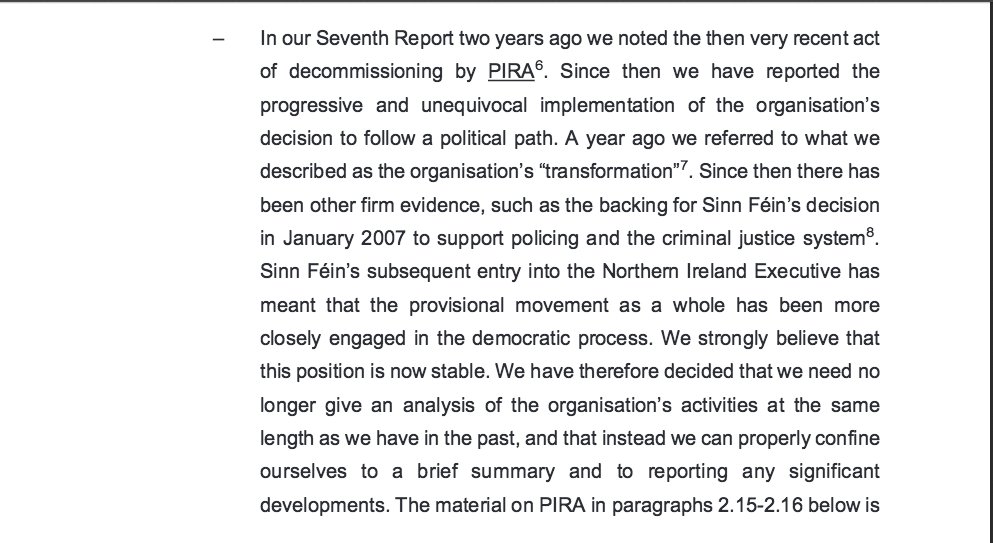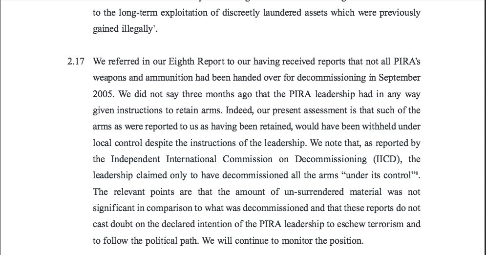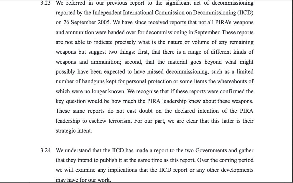 By this stage the un-decommisioned weapons didn’t even rate a mention in the IMC report. Instead the IMC said it was so confident of the veracity of the Provisionals journey into peaceful politics that it would limit from now on what it had to say about the IRA: