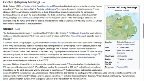 Rather than allowing Gillespie time to escape, as had been previous IRA practice, the bomb was detonated by remote control as he reached the checkpoint. Five soldiers were killed and the largest part of Gillespie’s body to be recovered was part of his hand.