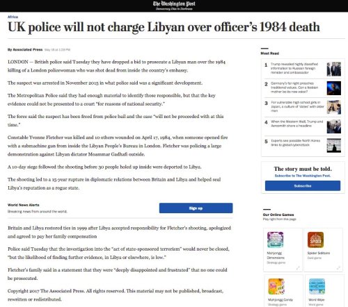 Do you remember all the fury and grief in Britain that followed the April 1984 murder of WPC Yvonne Fletcher at the hands of Libyan diplomats who shot her dead from an upper window of the Libyan embassy in London? Those vows to bring those responsible to justice?