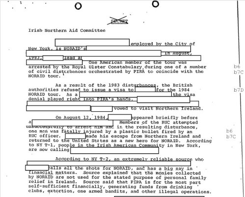 But Noraid was the public face of the Provos in America and a constant target of British politicians and media. There is also evidence in earlier FBI files published on this blog, of pressure from the Irish government on the US administration to harden up its animus towards Noraid.