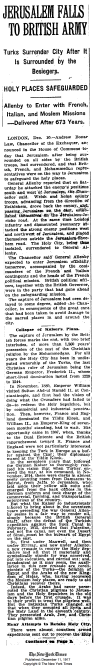 On December 11th, 1917, British forces, led by General Edmund Allenby, captured Jerusalem from the Ottoman empire, crowning a foray into Middle East politics featuring, amongst others, T E Lawrence, the so-called Lawrence of Arabia.