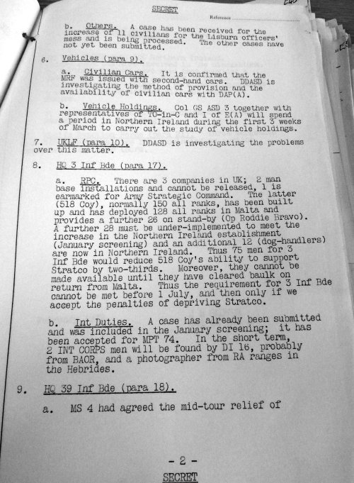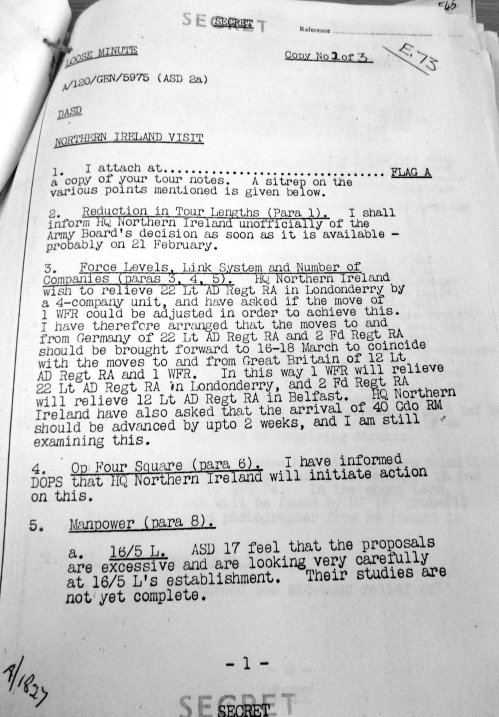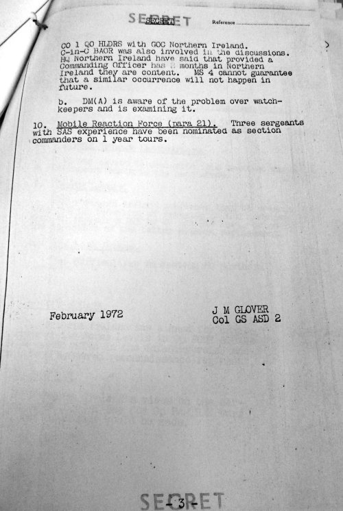 Evidence that at least the ‘Military Reaction Force’ claim was a lie comes in a ‘loose minute’ (jargon for an internal letter) prepared in the aftermath of a visit to Northern Ireland by one the British Army’s most senior officers, the Director of Army Strategic Defence (DDASD) , dated February 1972 and written by Colonel James Glover, then a senior member of staff at Army Strategic Defence.