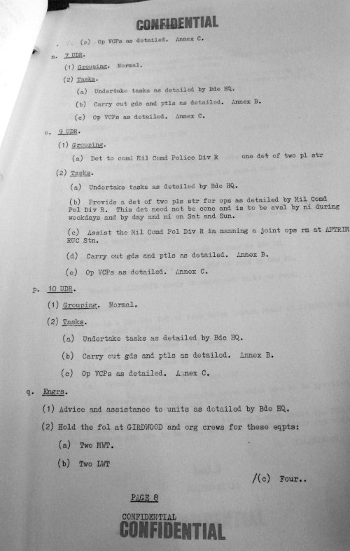 This document also has an intriguing reference to ‘Operation Four Square’, although it seems from the size of the operation – ’20 to 22′ infantry units – that this is not the same as the ill-fated attempt of the same name by military intelligence to discern IRA activists through the forensic examination of dirty laundry which was interdicted by the Provos’ Belfast Brigade in November that year.