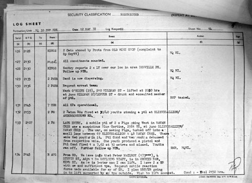 These log sheets below, which catalogue events in the Royal Anglian Regiment’s operational area in Belfast, describe an incident in which the CO of the Anglians requested the assistance of the ‘mobile reaction force’ in the arrest of the Adjutant of the Official IRA’s 1st Battalion, one Peter McIlroy.