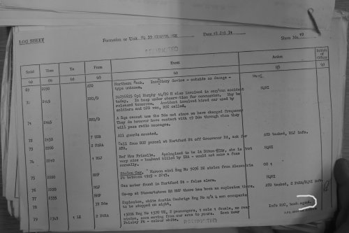Which bomb attack aroused suspicion about Mr Antonio is not clear but a 50lb IRA bomb was detonated in a manhole in nearby Flax Street the night before and this may have focussed the Bomb Squad on the whereabouts of the the night watchman. Here is the log sheet: