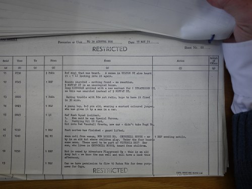 Log sheets from 39 Brigade – Kitson’s Brigade – are available for May 1971 through to July but not for the autumn months following the introduction of internment that August.