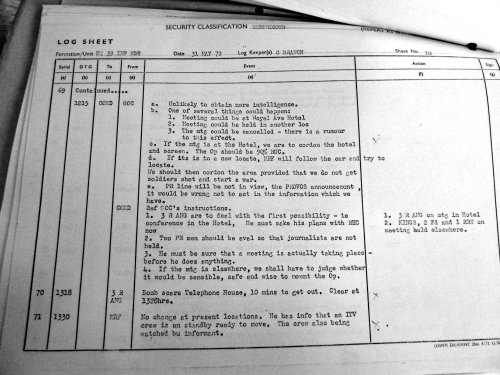 Ten months later, the available 39 Brigade log sheets make no mention at all of the Bomb Squad. Instead the MRF makes its first appearance, at least in the documents that are available from Kew for inspection.
