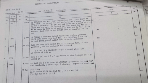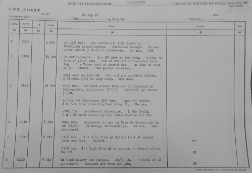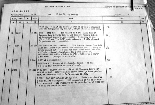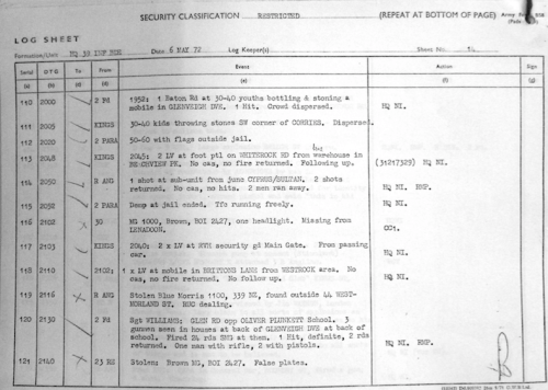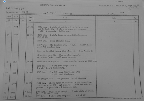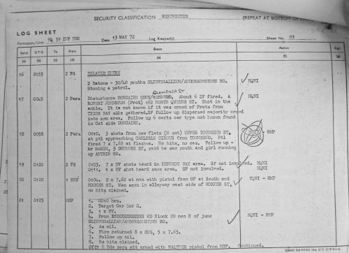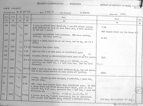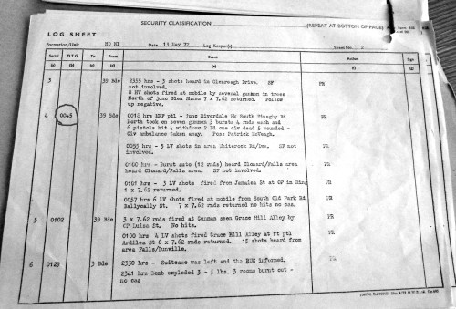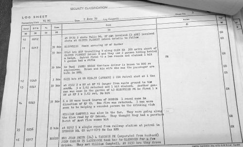 ‘233o hrs. Shots fired at MRF mobile ptl Shaws/Glen. 1 mil cas – in MPH – not serious. Fire returned at gunmen. 1 poss hit – 1 definite hit’.