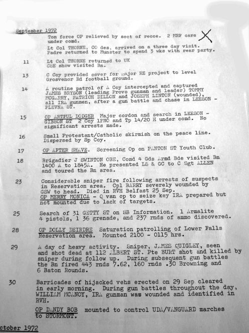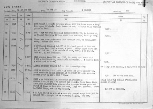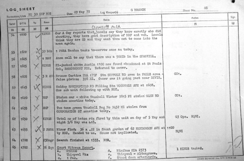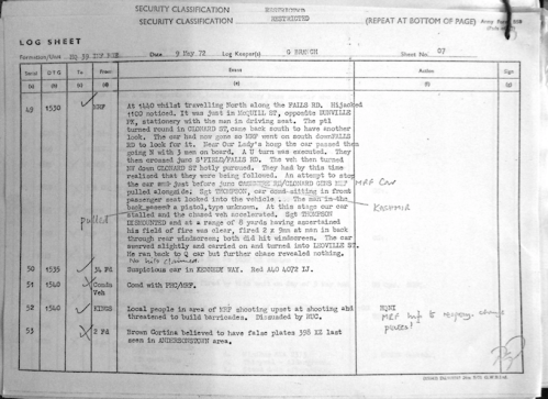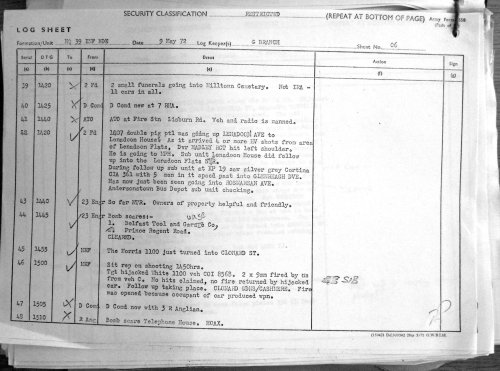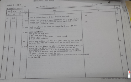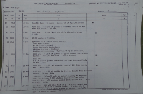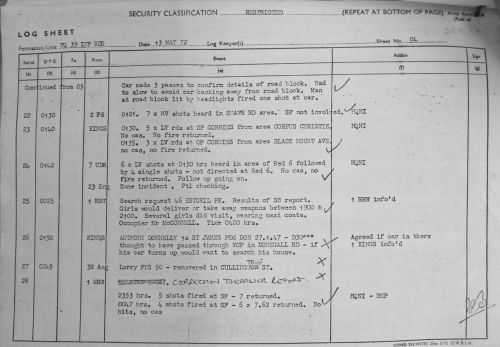 The available evidence from these log sheets suggests that in this case MRF personnel were probably not responsible for Jean Smyth’s untimely death, and that rather, she was an unfortunate but accidental casualty of the war raging in West Belfast in 1972, a war which, undeniably, the MRF had helped to escalate.