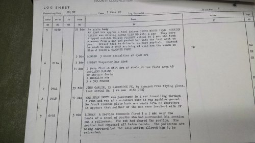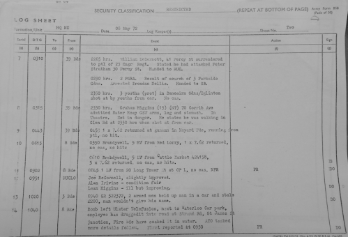 It is not clear whether the log sheets shown below were made available to the inquest although the hearing was told that forensic evidence supported the view that none of those shot had fired a weapon. The widow of Patrick McVeigh, whom the army misnamed as Joseph at one point, was awarded £20,000 in compensation. The case was re-opened in 1993 and MRF soldiers interviewed but with no result.