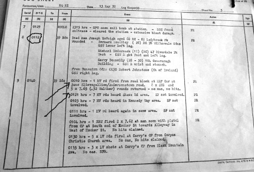 The first shooting happened at ten minutes past midnight on May 13th, 1972 and the MRF record in the 39 Brigade log sheet raised as many questions as it provided answers.