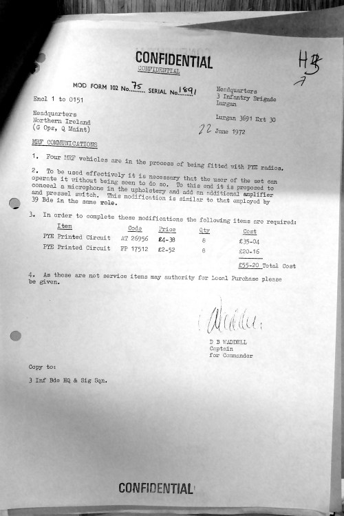 The following document, a ‘confidential’ authorisation request for circuit boards for the covert radio systems used by MRF patrols, shows that there were plans in June 1972 to create a four-car MRF unit in the 3rd Brigade area, which would take in south and north Armagh, Newry and other parts of the Border, increasingly violent IRA areas in 1972.