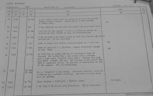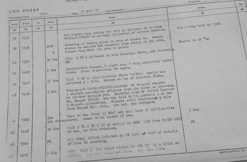Scanning the HQNI log sheets for June 22nd, the researcher would be hard pressed to know that any of this had happened. There are only two references to the Glen Road shooting, and to say they were short on information would not be an overstatement. This is the first, which fails to acknowledge MRF involvement at all.