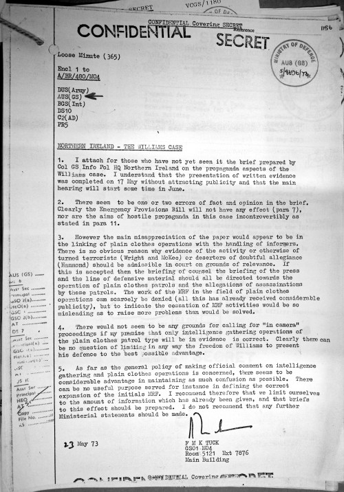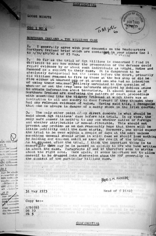The following Ministry of Defence correspondence concerning the imminent trial of Sgt Williams is interesting for a couple of reasons. The first is the official concern not to make public the MRF’s role in running double agents. Three are mentioned: Seamus Wright, Kevin McKee and Louis Hammond (about whom, more later).