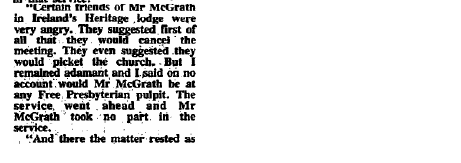 Flanked by James Heyburn, his Church Secretary, Paisley first read out a statement and then the press conference followed, which was dominated by a series of questions from myself and Andy Pollak and answers from Ian Paisley. Following that, on the next day, Valerie Shaw held her own press conference