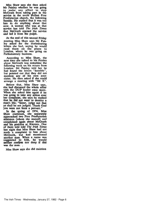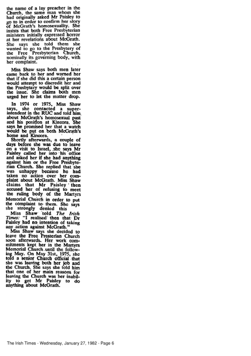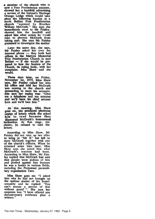 According to Miss Shaw’s testimony, she had informed Paisley on several occasions that William McGrath, who was well known to him because of their joint involvement in evangelical and Loyalist matters, was homosexual and was employed as a housefather at Kincora Boys Home. She was concerned about the welfare of the boys, but Paisley had ignored her warnings.
