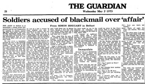 Gerry Fitt had alerted two Fleet Street reporters, Simon Hoggart of The Guardian and Robert Fisk of The Times who duly wrote up the story. Hoggart was present when Shields and Fitt phoned the Gloucester’s handler and his story, which led the back page of The Guardian on May 2nd, 1973, is reproduced below. Fisk also wrote about the incident but his article could not be located.