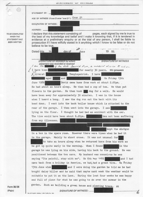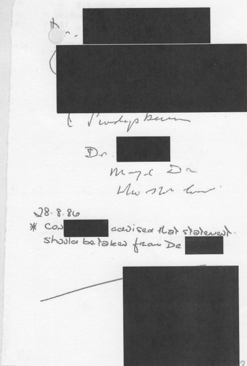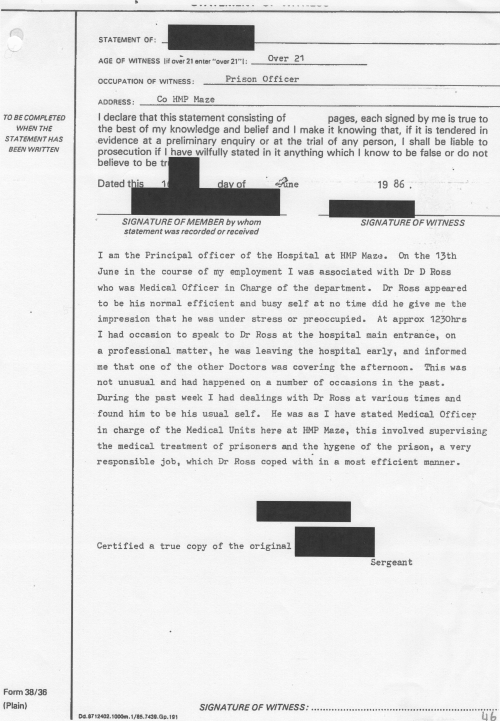 Much of the other witness statements have also been redacted, but again the task was done somewhat sloppily. For example, Dr Ross’ wife’s statement is redacted to hide her identity and relationship to her husband, but whoever was given the task, left her name, ‘Gladys Ross’, untouched as well one reference to ‘My husband…’.