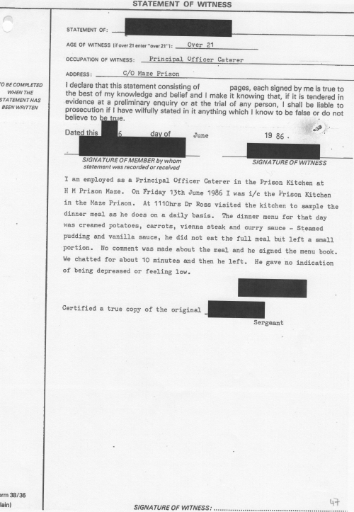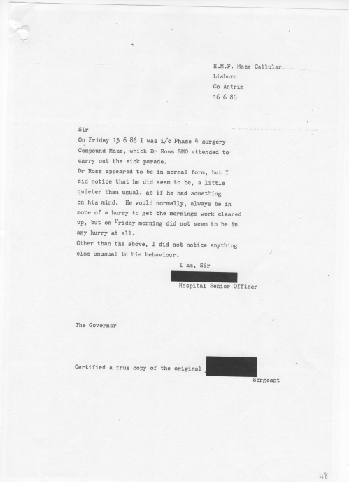 On Friday 13 6 86 I was i/c Phase 4 surgery Compound Maze, which Dr Ross SMO attended to carry out the sick parade. Dr Ross appeared to be in normal form, but I did notice that he did seem to be a little quieter than usual, as if he had something on his mind. He would normally, always be in more of a hurry to get the morning’s work cleared up, but on Friday morning did not seem to be in any hurry at all. Other than the above, I did not notice anything else unusual in his behaviour.