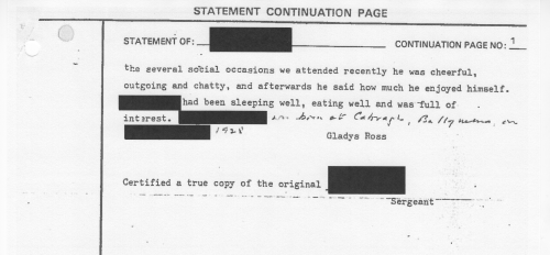 Much of the other witness statements have also been redacted, but again the task was done somewhat sloppily. For example, Dr Ross’ wife’s statement is redacted to hide her identity and relationship to her husband, but whoever was given the task, left her name, ‘Gladys Ross’, untouched as well one reference to ‘My husband…’.