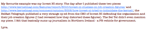 I can think of no more fitting tribute to Lyra McKee than her own words below, describing what was essentially her journalistic credo, written to me not long after we had first made contact in late 2012.