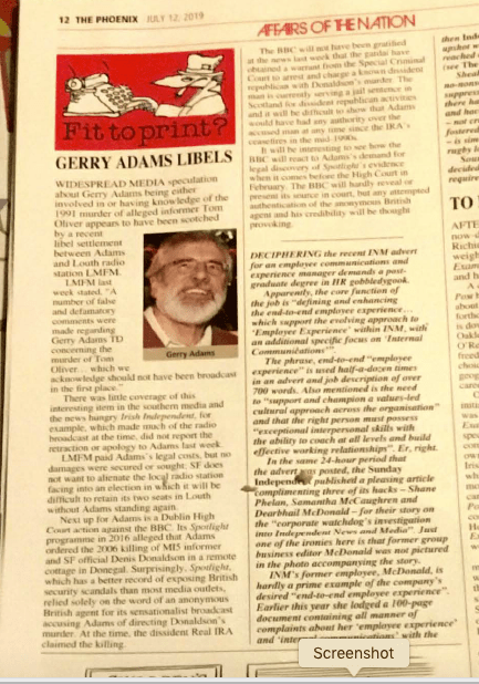 Phoenix clearly believes that having silenced media speculation about Adams’ alleged role in the Oliver slaying – the farmer was accused of spying on the IRA in the Cooley peninsula on behalf of the Garda Special Branch – this will strengthen the former IRA Chief of Staff’s hand when he faces the BBC in a Dublin court next February.
