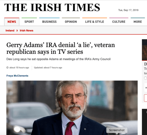 Des Long’s decision to call out Gerry Adams for lying about his membership of the IRA and revealing that he was at one point not just a member of the Army Council but its Chairman, comes at a bad time for the retired SF leader, but is good news for the BBC and for one of the production team involved in the TV series marking the 50th anniversary of the start of the Troubles.