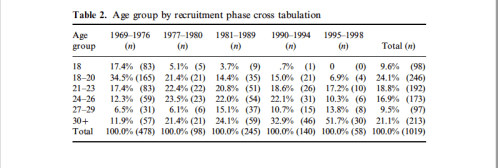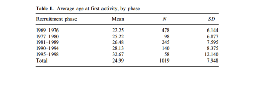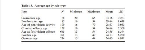 to make these like for like comparisons as the average age is likely to fluctuate across time because of organizational recruitment policy, tactics, strategies, and the contemporary dynamics of the campaign itself. Calculating the average age by phase shows an interesting pattern in that the average age of new recruits gets older as the campaign of violence progressed (see Table 1).