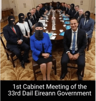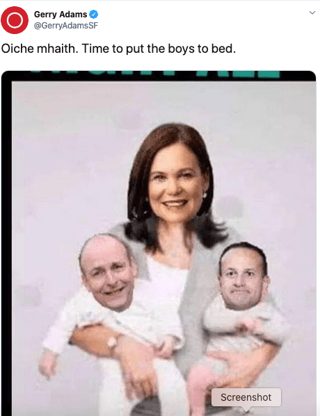 It was only later that I realised this was a reference to a photo of Mary Lou McDonald, who I think, for economy’s purpose, we can call MLM from now on, holding two baby-sized figures of Leo Varadkar and Micheal Martin: