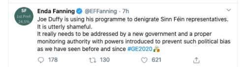 Here is the tweet issued by Mr Fanning yesterday afternoon which he published in response to items carried on RTE Radio One’s Joe Duffy programme and which Fanning said had ‘denigrated’ Sinn Fein representatives. Joe Duffy’s coverage, he claimed, was ‘utterly shameful’.