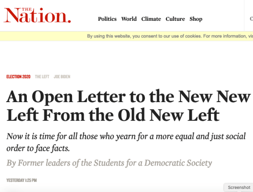 On April 13, 2020, Senator Bernie Sanders urged his supporters to vote for the presumptive Democratic nominee, former vice president Joe Biden. Writing as founders and veterans of the leading New Left organization of the 1960s, Students for a Democratic Society, we welcome Bernie’s wise choice—but we are gravely concerned that some of his supporters, including the leadership of Democratic Socialists of America, refuse to support Biden, whom they see as a representative of Wall Street capital. Some of us are DSA members, but do not believe their position is consistent with a long-range vision of democracy, justice, and human survival.