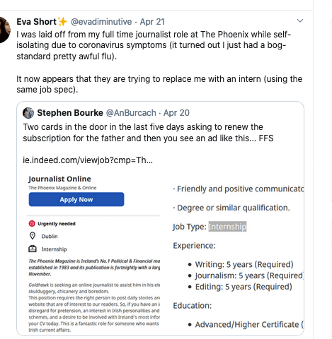 The story began with this tweet from the magazine’s former reporter Eva Short, posted this Tuesday, complaining about her sacking by Phoenix management after she self-isolated with suspected Coronavirus symptoms, and the decision to replace her with an intern whose qualification should be, wait for it, ‘five years experience’ as a journalist: