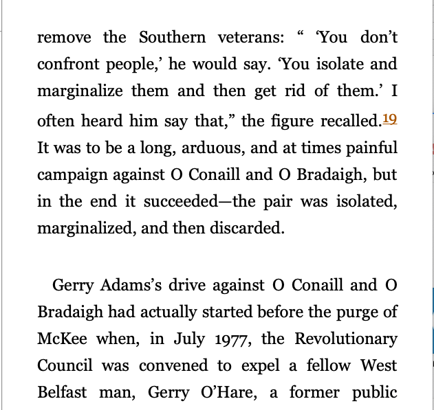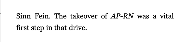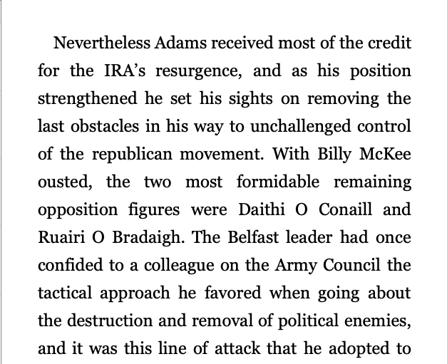These military successes were to be followed by Adams’ move to capture Sinn Fein, remove or neutralize opponents like Ruairi O Bradaigh and Daithi O Connail, and to make the Provos’ propaganda machine, that is the party’s two weekly papers, subservient to him and his followers.