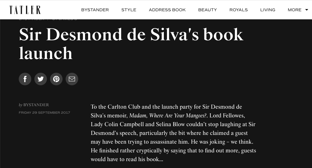 This is how Tatler magazine featured Sir Desmond de Silva’s book launch: