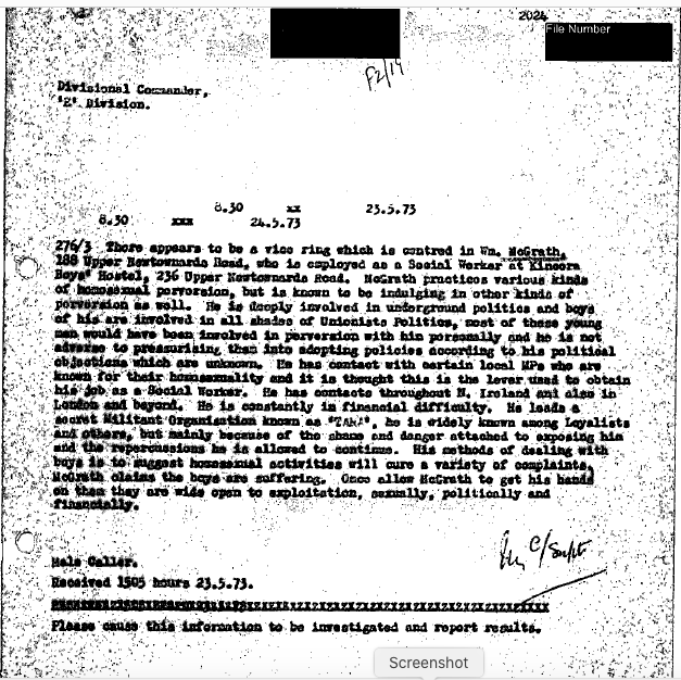 It is time the real truth about Kincora was told and the filing cabinets opened. In fact, beyond time. It is the least that is owed to the boys and young men whose lives were blighted by Britain’s spooks. Here is the RUC Special Branch report on McGrath and Tara, logged two months before Roy Garland dialed the confidential phone number at RUC HQ: