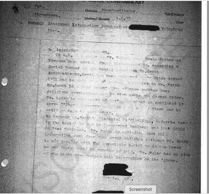 “On 4.6.73, I spoke to Mr Mains, head house father at Kincora Boys Hostel, Upper Newtownards Road, regarding a social worker at the hostel William McGrath. Apparently McGrath has been employed since August 1971 and is 36……..According to Mr Mains, McGrath is a very decent type of man and has deep religious convictions and is high up in the Orange Order……Mr Mains is satisfied that this information came from some crank and that although McGrath is not popular with the boys at the hostel he is convinced no one there could be capable of this. Mr Mains has no idea of who might have passed this information on the phone.”