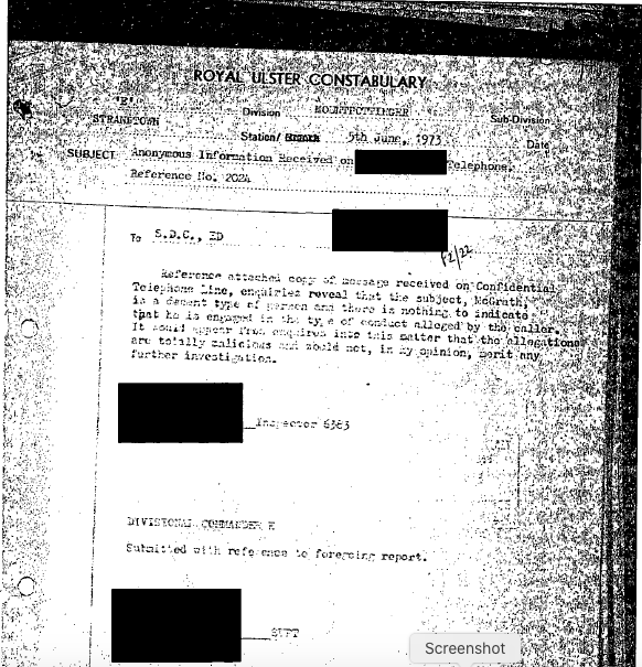‘Reference attached copy of message received on Confidential Telephone line, enquiries reveal that the subject McGrath, is a decent type of person and there is nothing to indicate that he is engaged in the type of conduct alleged by the caller. It would appear from enquiries into this matter that the allegations are totally malicious and would not, in my opinion merit further investigation.’