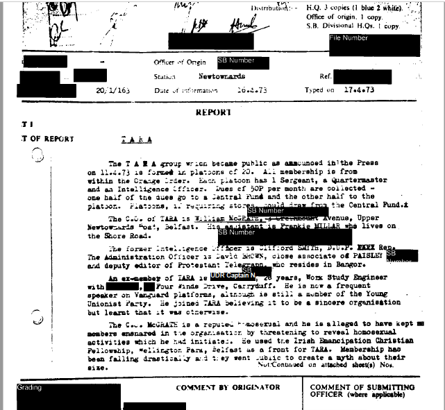 Dated April 17, 1973, two months before Roy Garland made his call to the Confidential Phone, the document is a Special Branch report on Tara, originating in Newtwnards, which names McGrath as the ‘C.O.’ of Tara; Frankie Millar as his ‘assistant’ and Clifford Smyth, a senior figure in Paisley’s DUP as the ‘former intelligence officer. The Administration Officer was David Brown, deputy editor of Ian Paisley’s Protestant Telegraph.