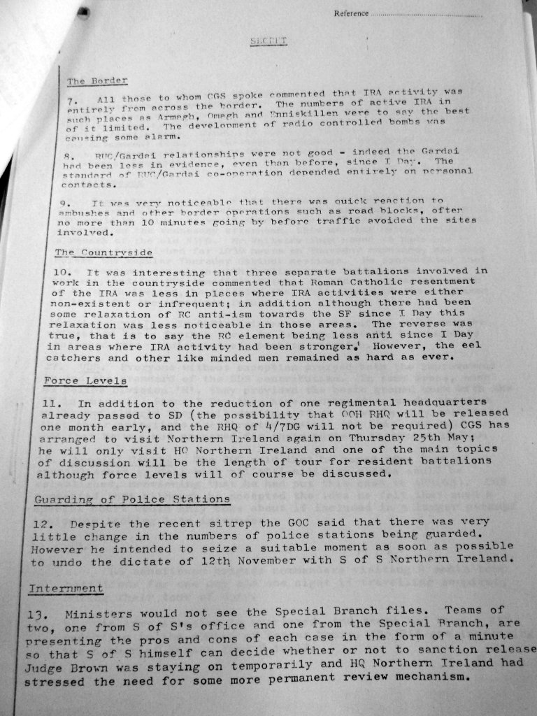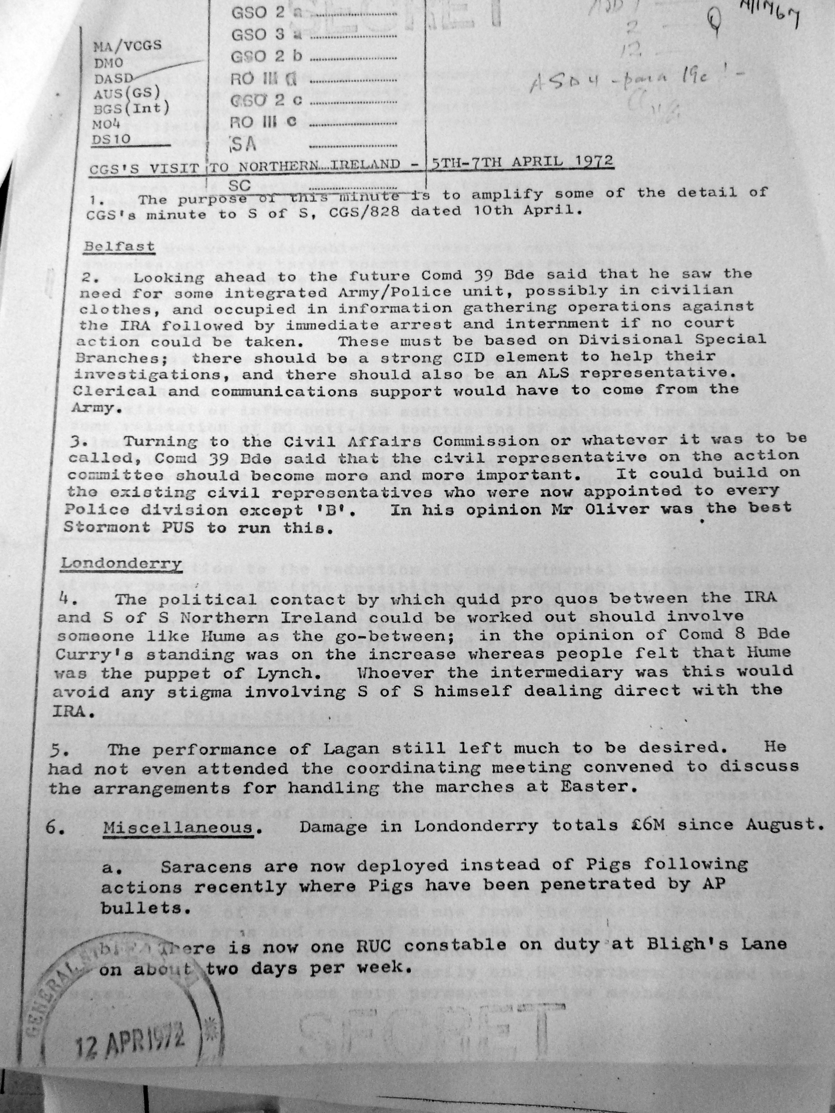 Following the events of 30 January 1972 and in a preparatory response to the Widgery Report on Bloody Sunday, and on 10 April 1972, the CGS wrote: