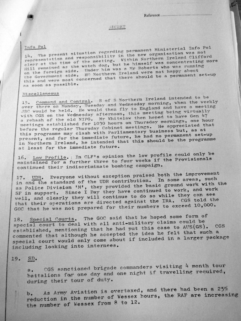 We consider that, under the extreme situation envisaged, the GOC should exercise operational control of the RUC for security operations. This would give him the power of direction over the Chief Constable, and D Int (Director of Intelligence) power of direction over Special Branch….We see no reason to change the GOC’s relationship with the new Governor from that existing at present with SSNI. However, we are not at all clear on the new position of SSNI, if indeed his Cabinet appointment is to continue.