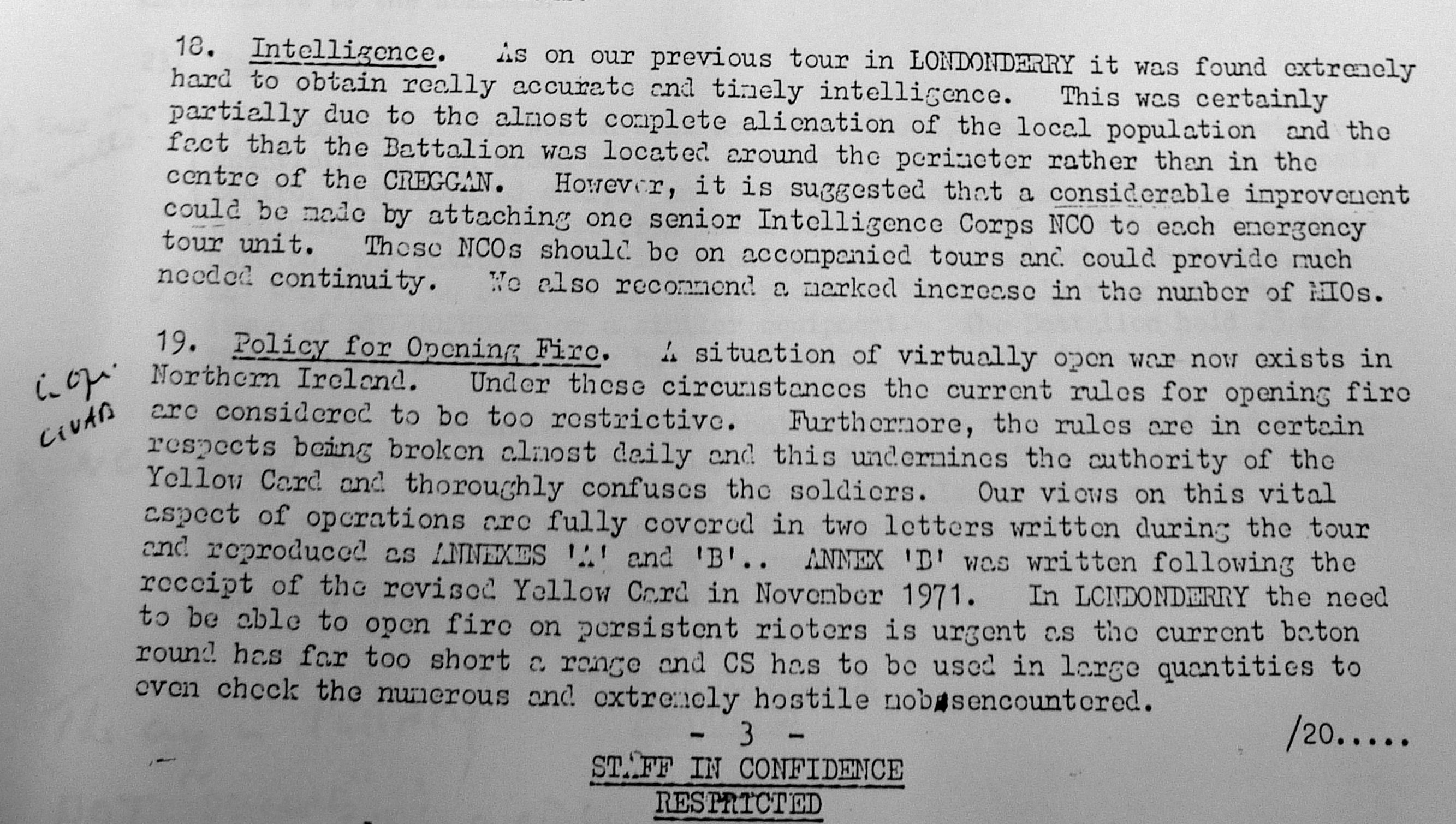 Here is an extract from a post-tour report of Derry’s Creggan district from the Coldstream Guards (the guys who wear those furry hats outside Buckingham Palace) admitting that the Yellow Card rules were being broken ‘almost daily’, undermining the Yellow Card’s authority and confusing the soldiers. The regiment also wanted to use live rounds on rioters because the rubber bullets did not have adequate range and instead CS gas had to be used: